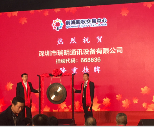 2016年1124日,瑞明通訊設備有限公司成功登陸深圳前海“新四版”。掛牌儀式同日在深圳前海股權交易中心隆重舉行,公司總經理王國明及其他領導出席并見證了這一重要歷史時刻(掛牌代碼:668636)。此次掛牌意味著瑞明通訊向資本市場邁進了重要的一步。同時也為日后企業正式對接主板市場奠定了堅實的基礎。